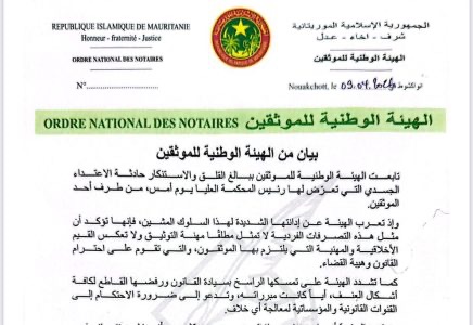 جاء ذلك عبر بيان أصدرته الهيئة اليوم، أكدت فيه أن الموثقين يلتزمون بمبادئ احترام القانون وهيبة القضاء، مشددة على رفضها القاطع لكافة أشكال العنف مهما كانت أسبابه أو مبرراته، داعية إلى ضرورة الاحتكام إلى القنوات القانونية والمؤسساتية لمعالجة أي خلافات.