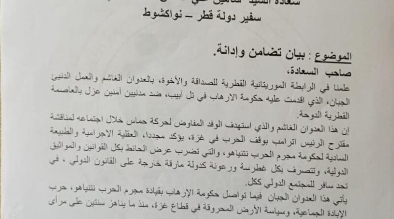 Read Moreدانت الرابطة الموريتانية-القطرية للصداقة والأخوة، أمس الاثنين، العدوان الذي نفذته حكومة الاحتلال الإسرائيلي ضد مدنيين آمنين في العاصمة القطرية الدوحة،